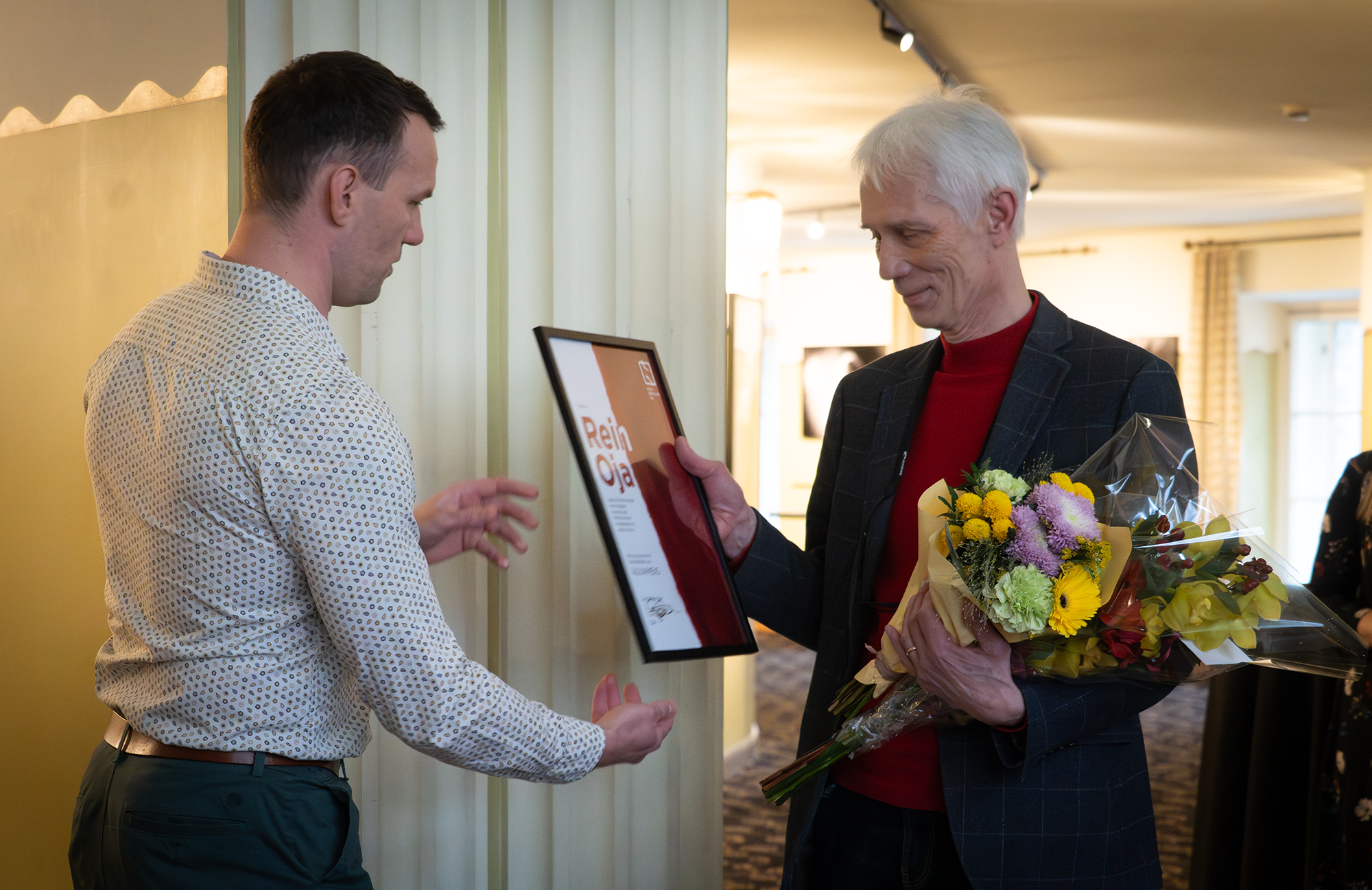 Fotol ENLi esimees Reimo Sagor Rein Ojale auliikme auaadressi üle andmas. Allikas: Eesti Draamateater